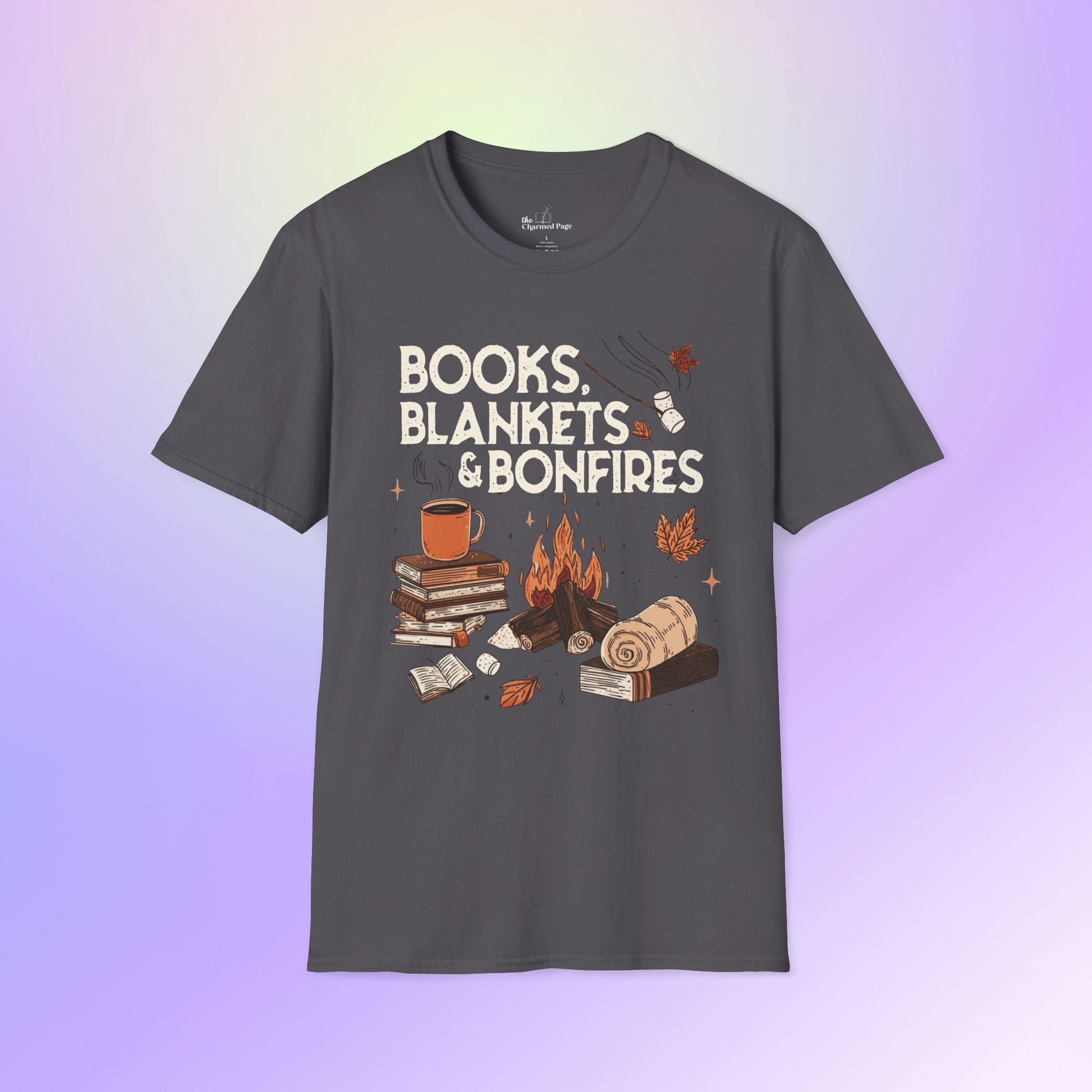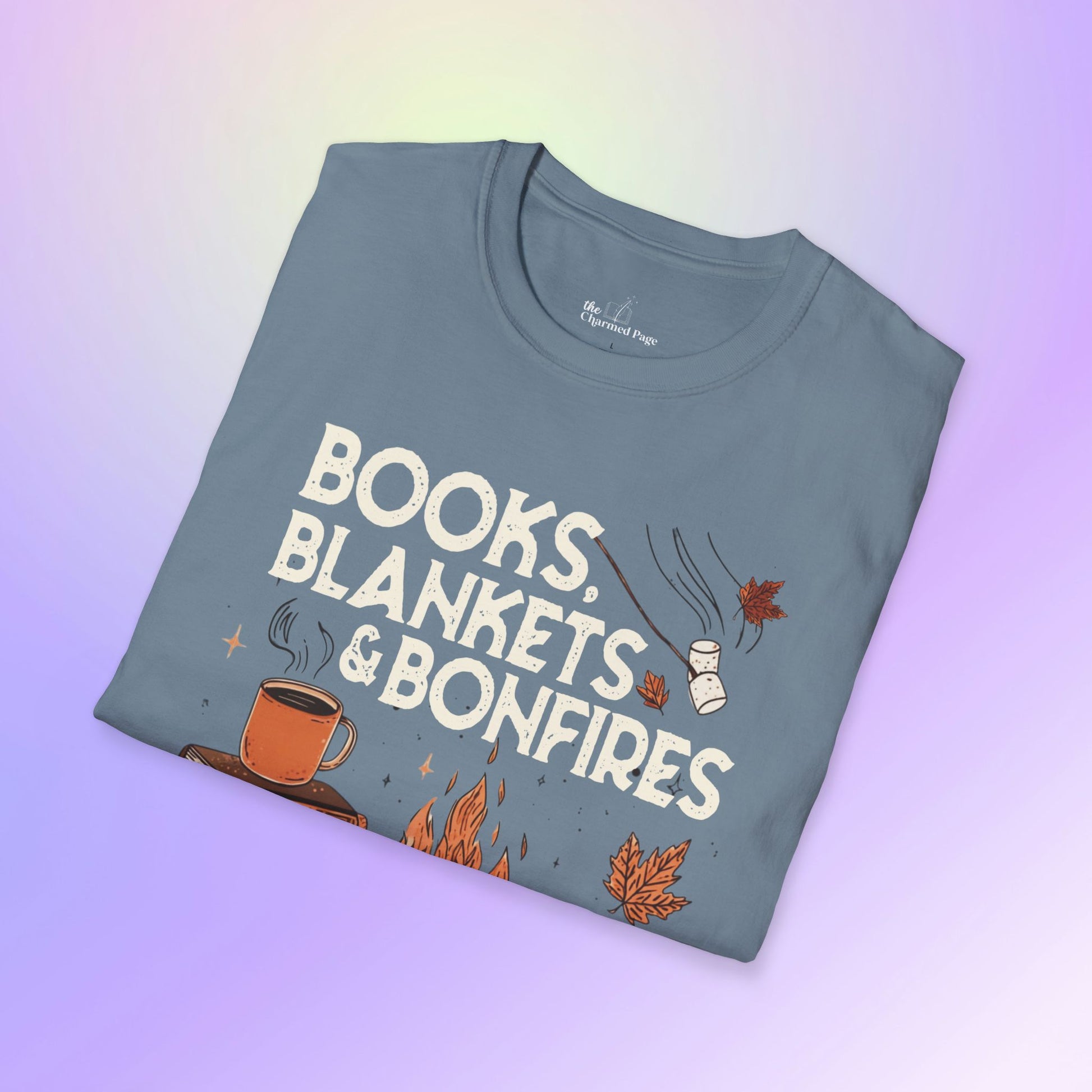 A cozy unisex t-shirt featuring a 'books, blankets, and bonfires' design, perfect for fall and autumn vibes. This t-shirt is ideal for those who love the comfort of a soft tee and enjoy the cozy atmosphere of the season. Suitable for adults looking for a stylish and comfortable wardrobe addition for casual wear during the fall season and autumn holidays.