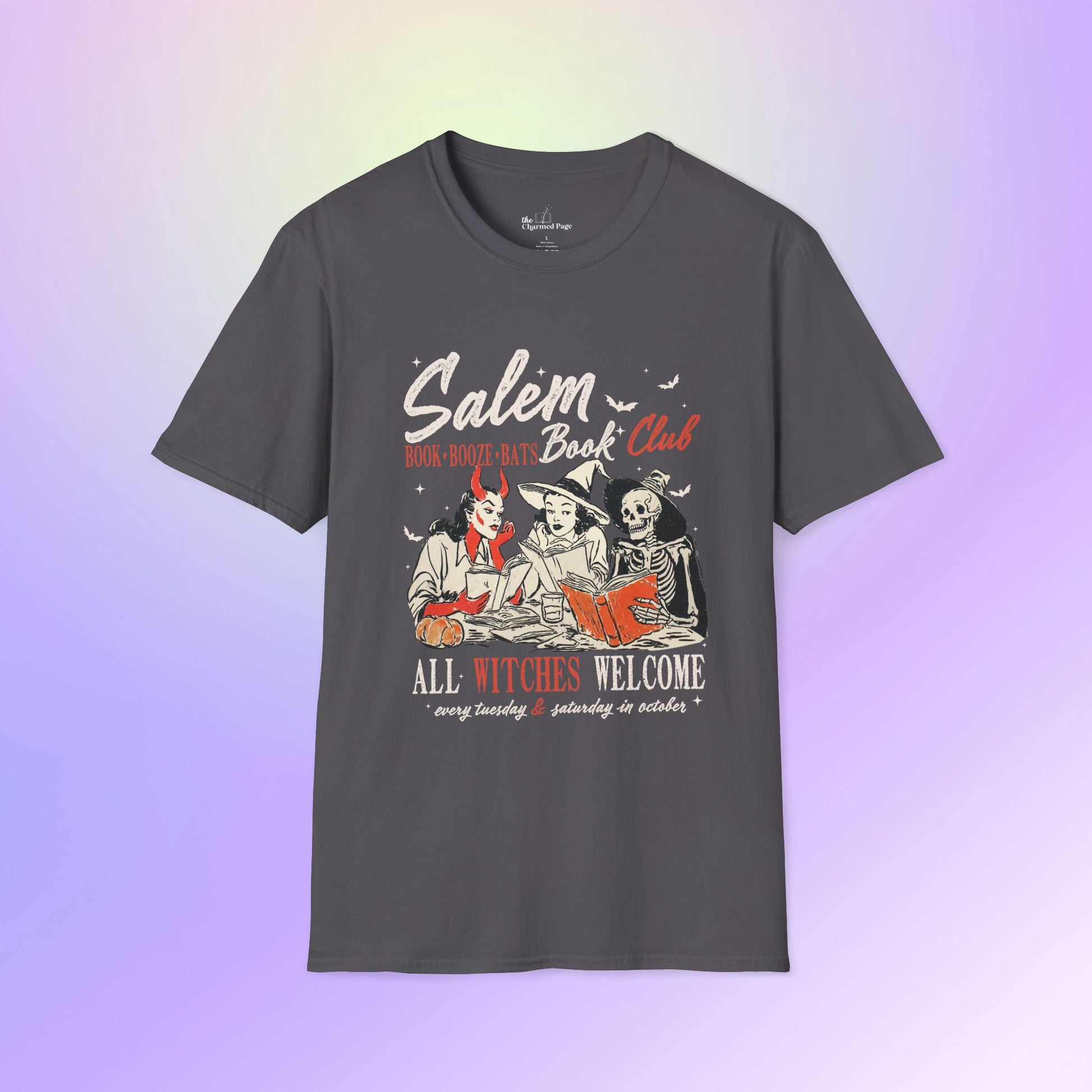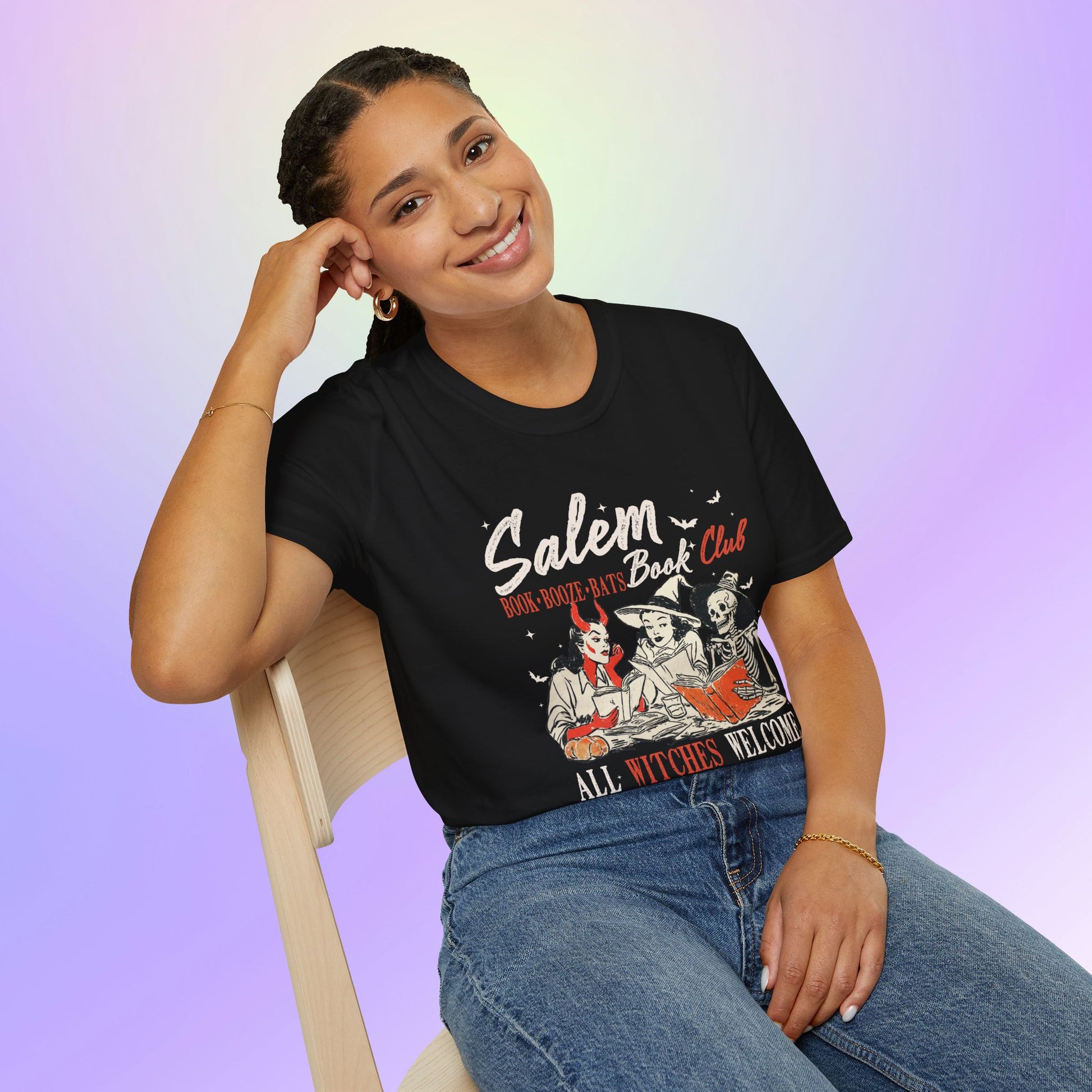 A Salem Massachusetts book club-themed T-Shirt featuring devil, skeleton, and witch designs. Perfect for those who love spooky and occult aesthetics, this T-Shirt is ideal for Halloween, gothic enthusiasts, and book club members. It offers a unique and eerie vibe to any outfit, making it a great conversation starter.