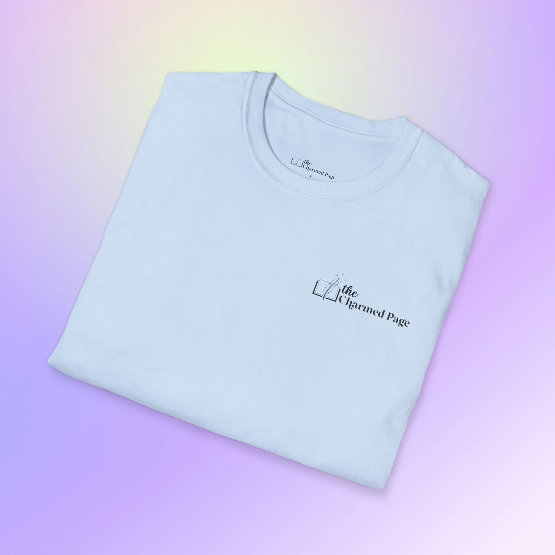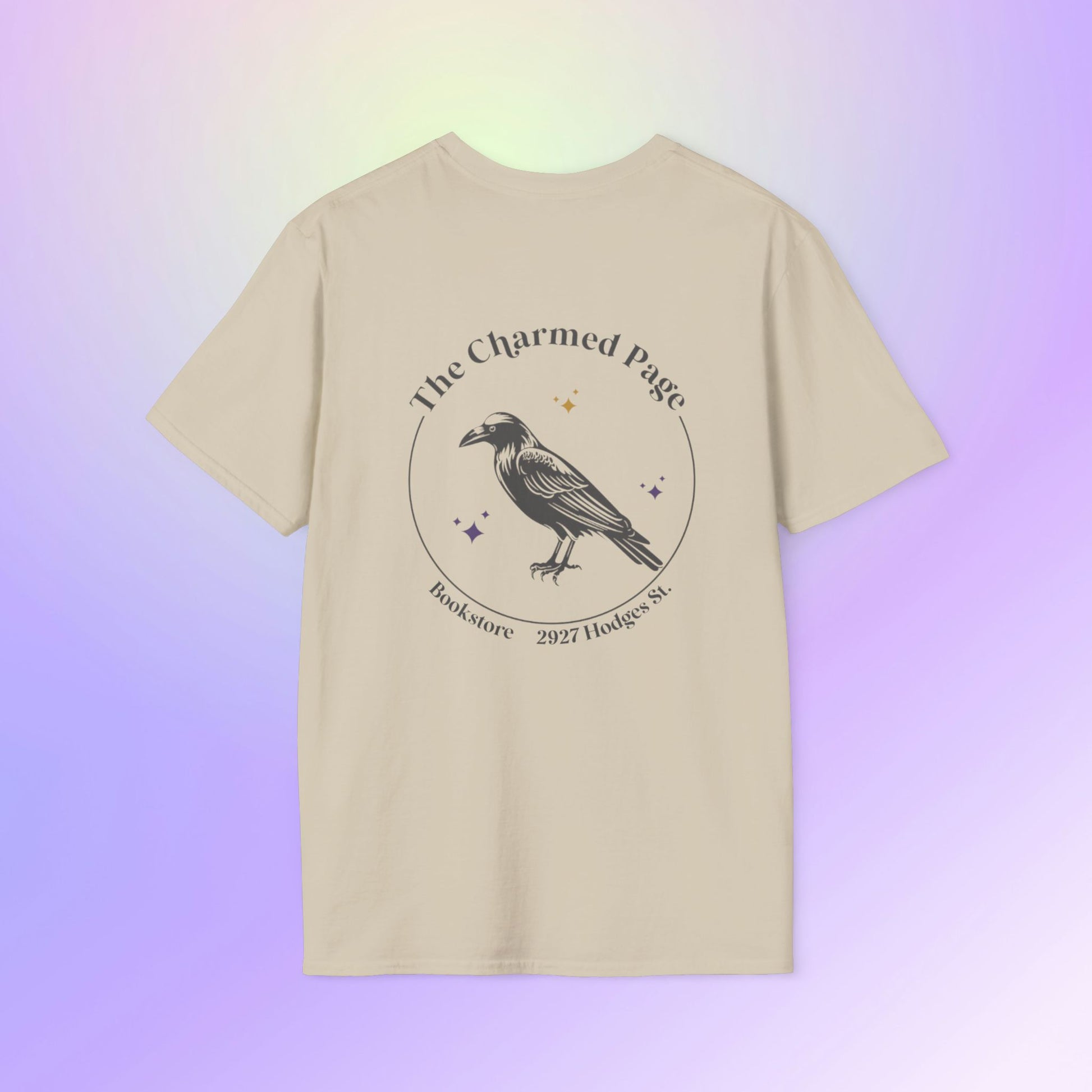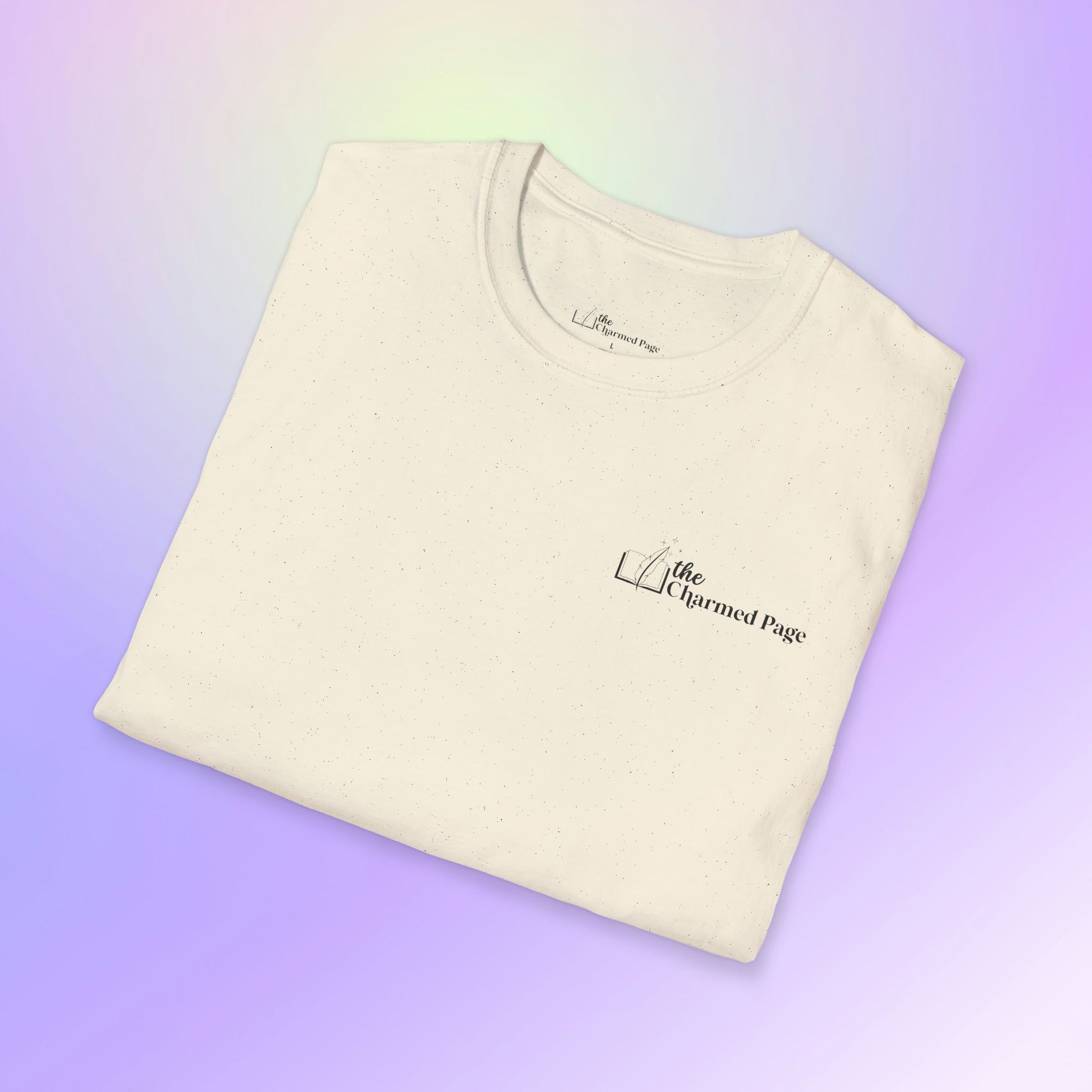 The Charmed Page Bookstore T-shirt with black logo exudes a cozy and bookish vibe, perfect for book lovers and avid readers.