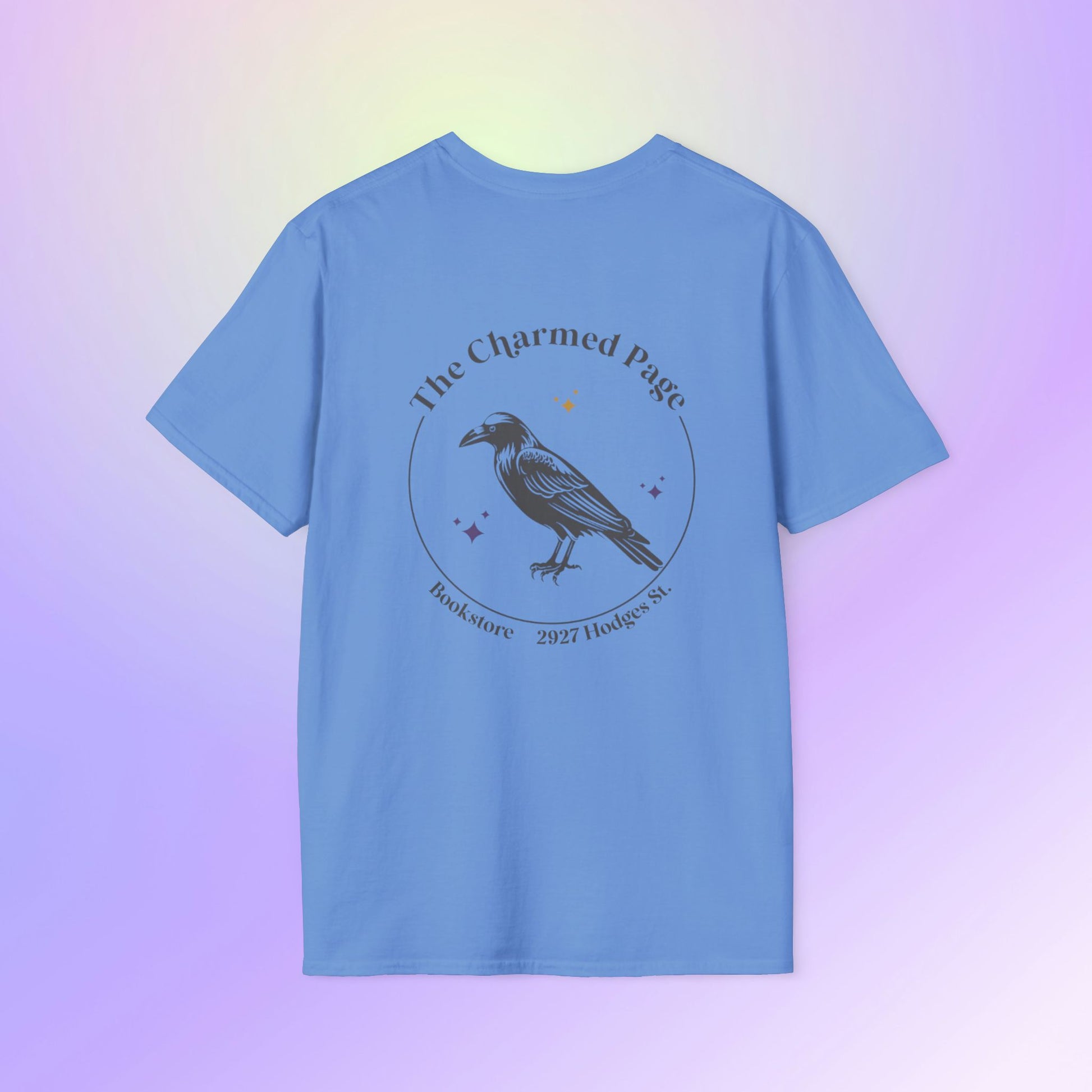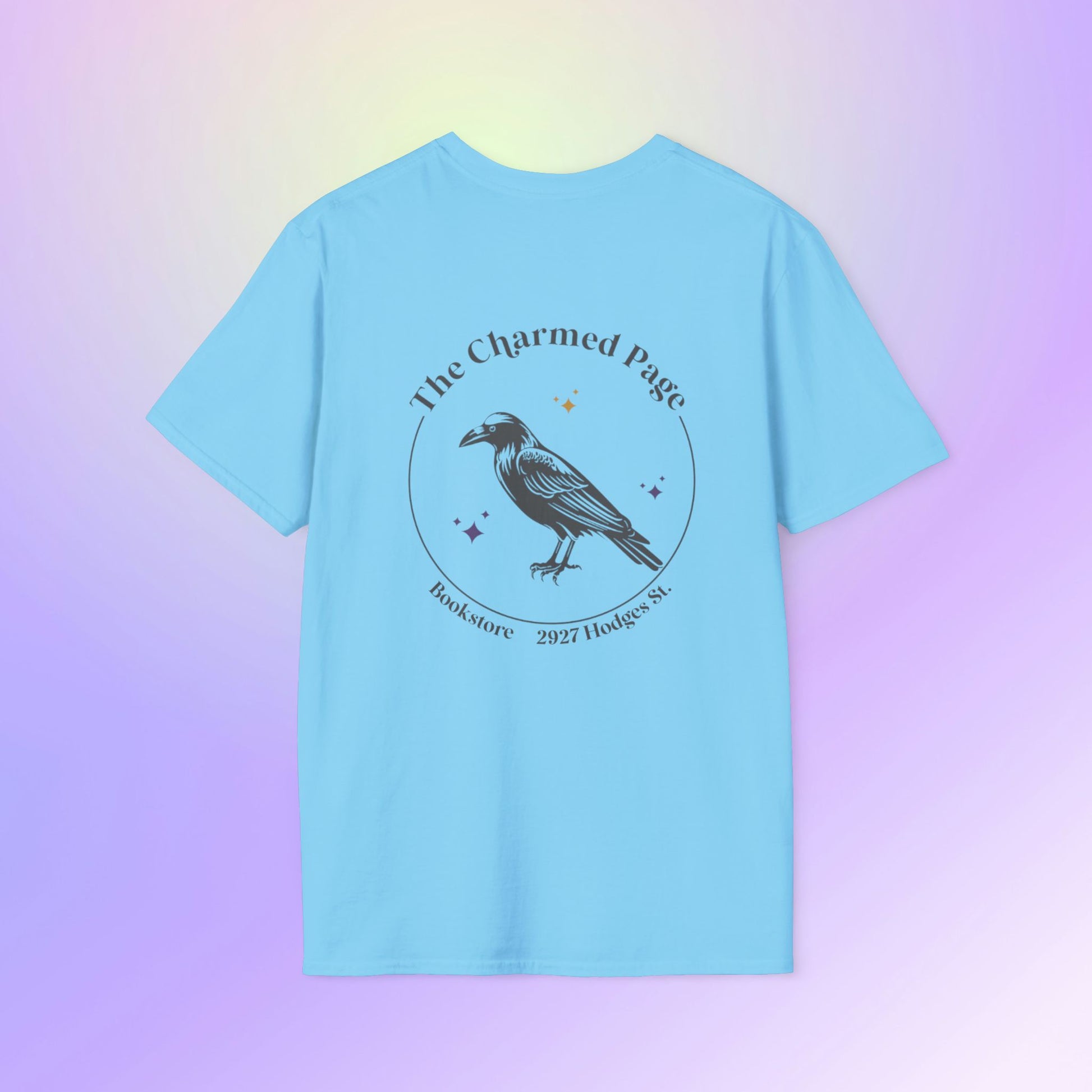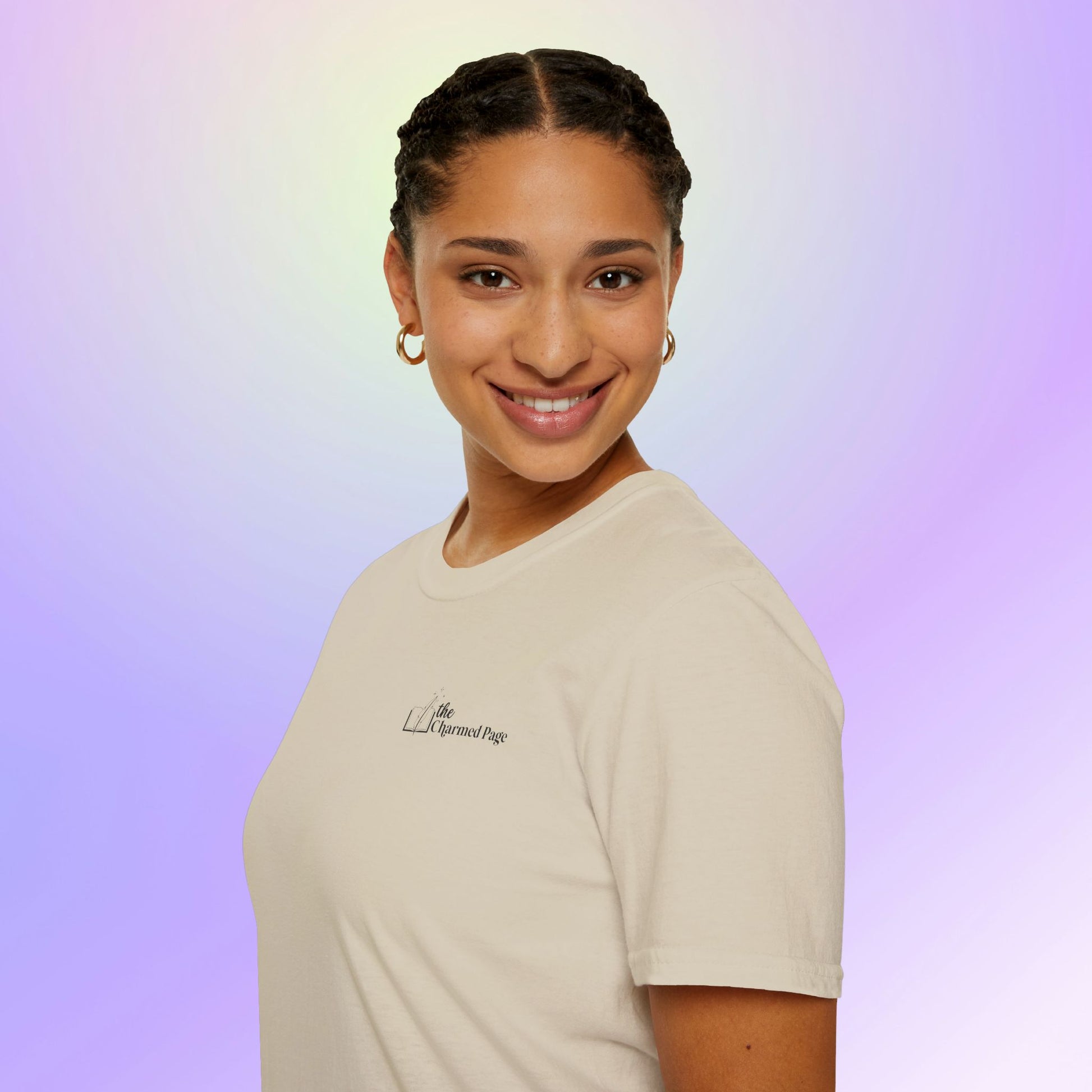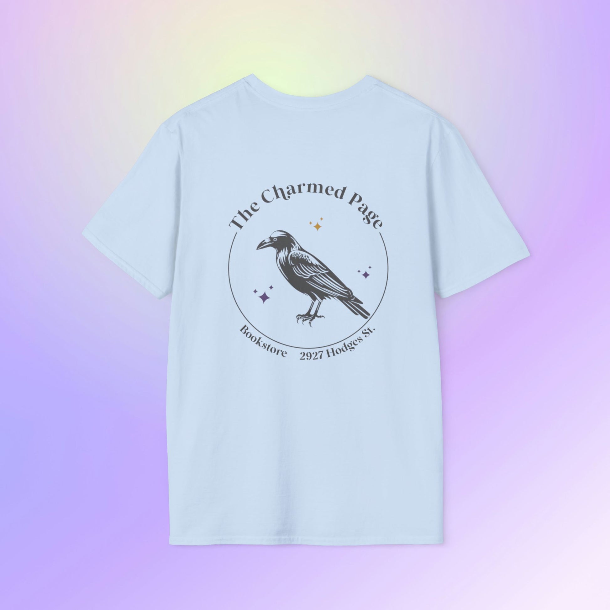 The Charmed Page Bookstore T-shirt with black logo exudes a cozy and bookish vibe, perfect for book lovers and avid readers.